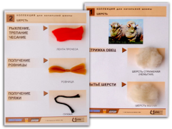 Описание: Коллекция поставляется в картонной коробке. Образцы шерсти, пряжи, нитей и тканей размещены на картонных ламинированных планшетах. Сопровождаются краткими пояснениями технологии переработки шерсти.